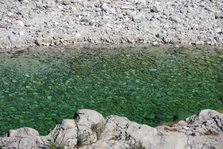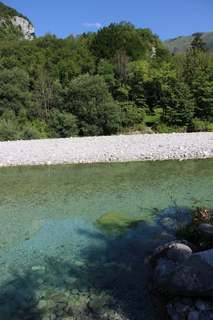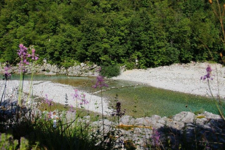 Turkizno modra Nadiža kar kliče po skoku v vodo, po plavanju in poležavanju ob njej.