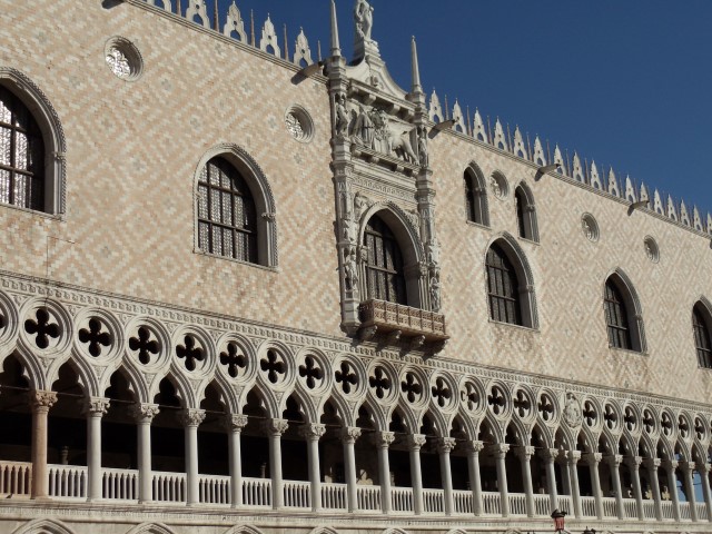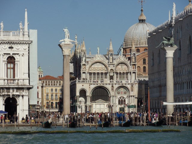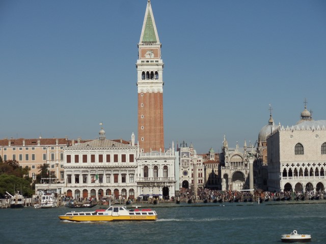 Glavna beneška katedrala “Basilica di San Marco”, znameniti 100 m visok zvonik “Campanile San Marco”, ki je najvišji v Benetkah. Povsem desno pa Doževa palača “Palazzo Ducale di Venezia”. Tokrat pogled iz katamarana.