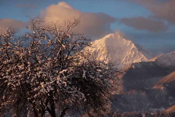 Kočna in Grintovec tokrat še bela, a kmalu zatem obarvana rdeče in roza.
