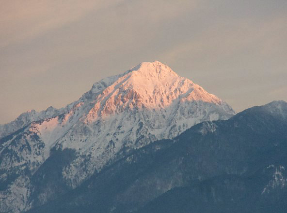 Vrhove gora obližejo prvi rdeči sončni žarki, ki sčasoma postanejo vse bolj svetli in beli.